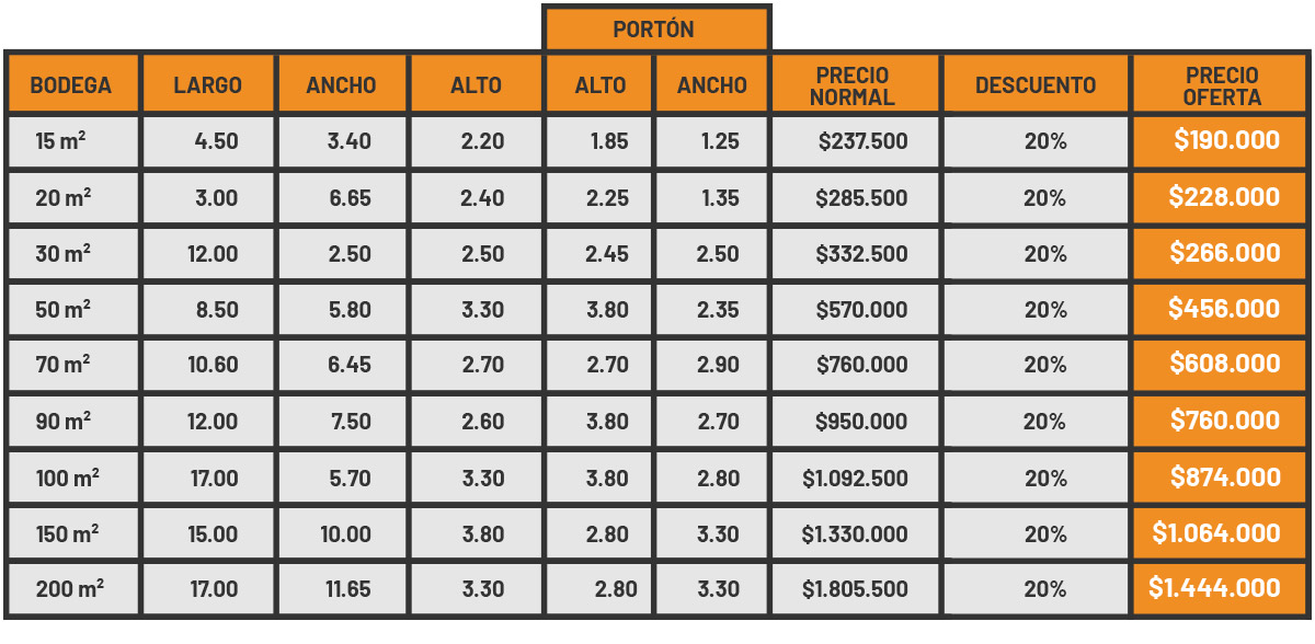 *Oferta válida para bodegas contratadas hasta el 31 de octubre de 2024. Valor de $190.000 +IVA mensual corresponde a precio de arriendo de bodega de 15 m2. Valores según UF del día 1 de agosto de 2024.